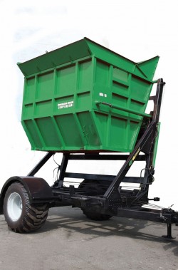 Полуприцеп выполнен со специальным телескопическим дышлом с целью увеличения возможностей использования, что позволяет при минимальной длине дышла, агрегатировать полуприцеп с трактором и, выполнять те же функции накопителя-перегрузчика.