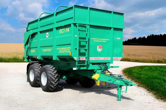 Полуприцепы тракторные нового поколения ПСТ-14, ПСТ-18 и ПСТ-24 - это унифицированные полуприцепы повышенной грузоподъемности на широкопрофильных шинах к тракторам «БЕЛАРУС» тяговых классов 2-5. Основной цельнометаллический кузов с открывающимся при помощи гидроцилиндров задним бортом, имеет вместимость рассчитанную на перевозку материалов средней плотности (земля, мусор, навоз, силос готовый, удобрения минеральные) с учетом естественного насыпного конуса (шапки). По заказу, для перевозки семян различных культур, корнеклубнеплодов, комбикорма полуприцепы комплектуются низкими надставными бортами, а для легковесных грузов-высокими надставными бортами.