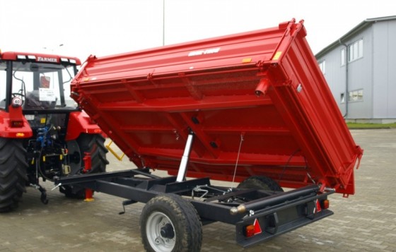 Одноосный прицеп с трехсторонней разгрузкой ёмкостью 3,5 т. Прицеп может быть также платформой, после разборки стен и столбиков.
