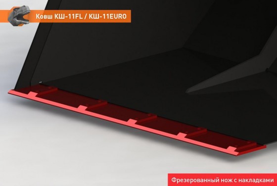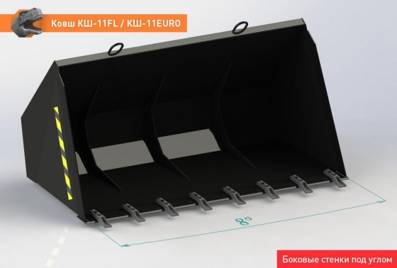 Усиленный ковш КШ-1.1FL со съемными зубьями для фронтального погрузчика FRONTLIFT. Предназначен для работы с сыпучими грузами небольшой весовой плотности (песок сухой, грунт сухой, минеральные удобрения, зерно, торф, снег).