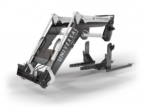 Усиленное сечение стрелы Универсал PREMIUM позволяет поднимать максимально тяжёлые грузы (2000 кг.) на максимальную высоту (4000 мм), что обеспечивает удобную погрузку на самосвалы с любой высотой борта. ПРЕИМУЩЕСТВА ПОГРУЗЧИКА УНИВЕРСАЛ PREMIUM НОВОГО ПОКОЛЕНИЯ Полуавтоматический быстросъём с трактора. Чтобы установить погрузчик на трактор больше не требуется выходить из кабины. Механизм быстросъёма автоматически зафиксируется при наезде трактором. Для снятия погрузчика с трактора необходимо выйти из кабины и отжать 2 кнопки на механизме быстросъёма, что займет пару секунд. Автоматический быстросъём рабочих органов. Инновационный механизм соединения с рабочим органом позволяет установить его без участия оператора (для этого впервые в механизме запирания рабочего органа применён гидроцилиндр). Гидросистема погрузчика скрыта внутри стрелы и поперечной балки, что улучшает обзорность, защищает РВД гидросистемы от повреждений. Усиленное сечение стрелы. Размеры профиля в опасном сечении 294х80 мм со стенкой 5 мм. Мощные подрамники. Балки подрамников изготовлены из стали толщиной 16-20 мм (зависит от модели трактора). Стойка подрамника изготовлена из стали 40 мм. Балка на задний мост распределяет нагрузку по всей раме трактора. Увеличенные углы выворота ковша: в верхнем положении стрелы до 70°, у земли – до 66°. Все шарнирные соединения оснащены подшипниками скольжения, а смазка осуществляется через пресс-масленки. Рамка для установки инструмента с еврокреплениями (EURO/SMS) любого производителя.