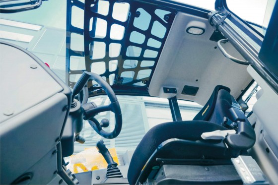 - Закрытая звукоизолированная кабина (соотв. стандартам ROPS-FOPS) с отоплением. Передний и задний стеклоочистители, открывающийся люк, заднее открывающееся окно, разъем для авторадио, регулируемый руль.