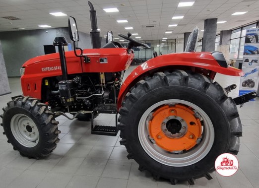Shifeng (Шифенг) SF-404C без кабины красного цвета оснащается экономичным, четырехтактным, 4-х цилиндровым дизельным 40-ка сильным двигателем (YND 490BT) жидкостного охлаждения, полноприводной (4х4) механической трансмиссией (с пониженным рядом и блокировкой заднего дифференциала), счетчиком моточасов. За функционирование гидравлической системы трактора Shifeng (Шифенг) SF-404C отвечает гидронасос, критическим давлением 16 МПа. Дополнительно в базовую комплектацию входит: pадний вал отбора мощности (ВОМ) 540 об/мин., задняя 3-х точечная навеска, задний гидравлический распределитель с рычагом управления, фронтальные и задние противовесы.